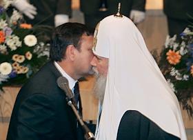 Губернатор Ленинградской области Валерий Сердюков (слева) награждает Патриарха Московского и Всея…