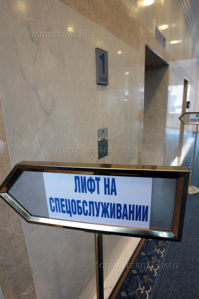Указатель "Лифт на спецобслуживании" в здании РАО "Газпром".
