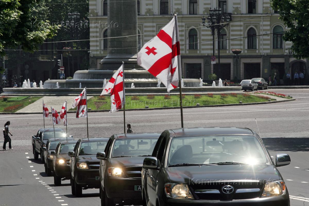 Эскорт автомобилей с государственными флагами Грузии на репетиции военного парада в Тбилиси.