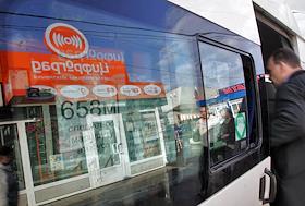 Автомобиль маршрутного такси. Отражение магазина розничной сети мобильной электроники "ЦИФРОГРАД" на…