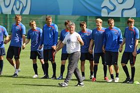Главный тренер сборной России по футболу Гус Хиддинк (справа) и игроки сборной на тренировке перед…