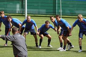 Игроки сборной России по футболу на тренировке перед матчем со сборной командой Испании на…