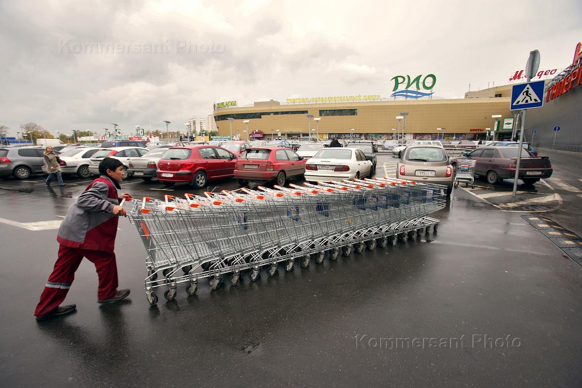 Торгово-развлекательный центр "РИО". Сотрудник службы уборки и обслуживания супермакета собирает…