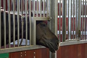Кубок "Ягуар" по конкуру прошел в поселке "Горки 10". Лошадь в конюшне.