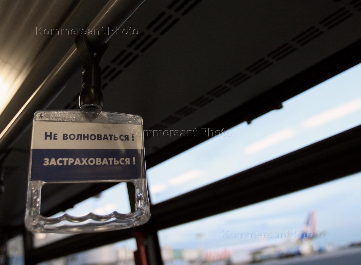Табличка "Не волноваться! Застраховаться!" в автобусе в международном аэропорту "Внуково".
