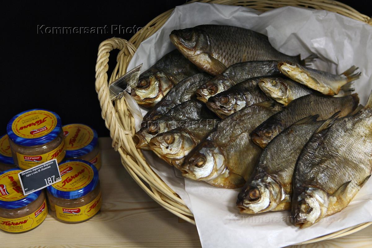 Вяленая рыба в плетенной корзинке и консервы с печенью трески.