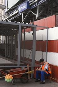 Рекламные щиты рекламной компании "News Outdoor" в центре Москвы. Рабочий коммунальной службы.