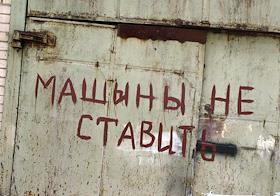 Надпись на воротах гаража: "Машыны не ставить".