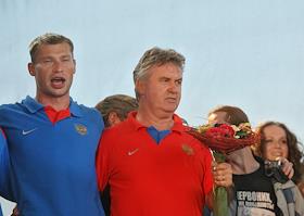 Главный тренер сборной команды России по футболу Гус Хиддинк (в центре) и игрок сборной команды…