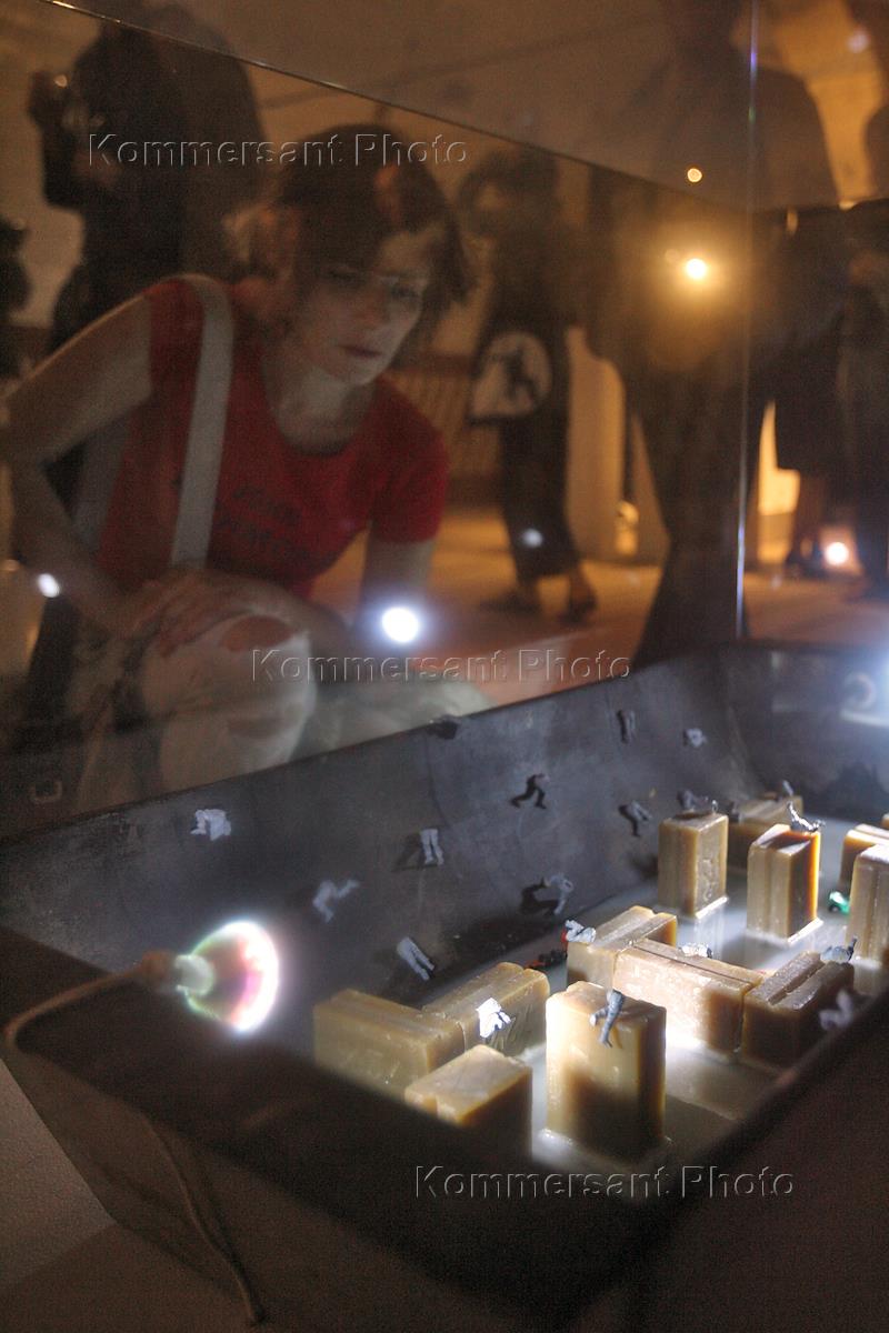 Первая международная биеннале молодого искусства "Стой! Кто идет?". Посетительница на выставке…