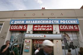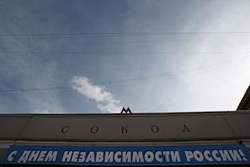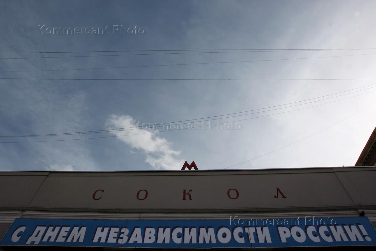 Плакат над входом в метро "Сокол" "С днем независимости России".