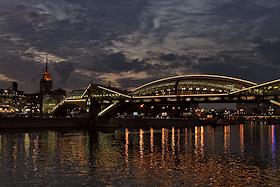 Виды ночной Москвы. Пешеходный мост Богдана Хмельницкого через Москву-реку у Киевского вокзала.