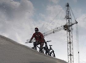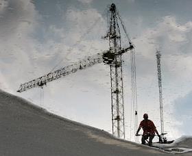 Городская среда города Дубна. Отражение подъемного крана и велосипедиста в луже.