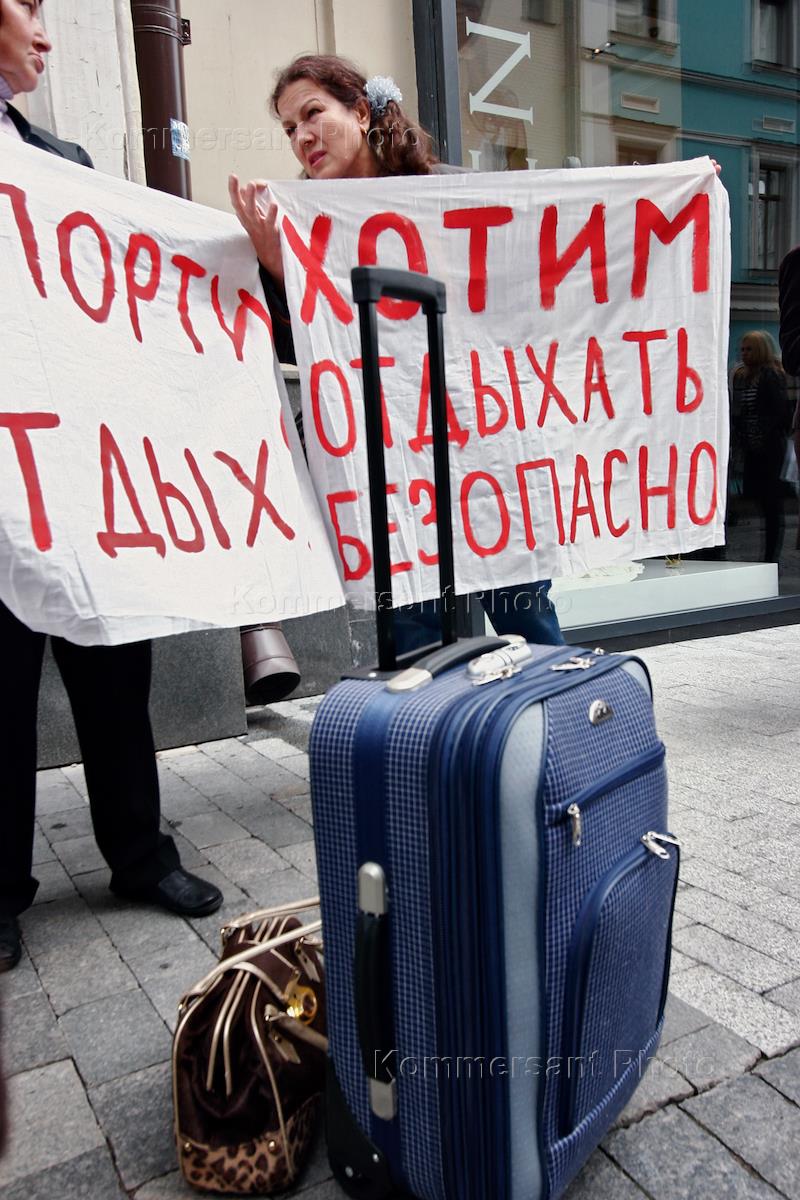 Экономика и бизнес Пикет инициативнаой группы граждан, недовольных уровнем безопасности российских туристов на популярных курортах напротив здания Российского союза туриндустрии.