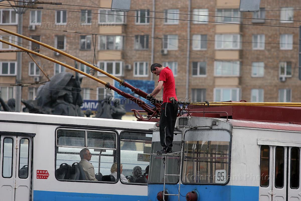 Водитель троллейбуса устанавливает слетевшие с проводов штанги.