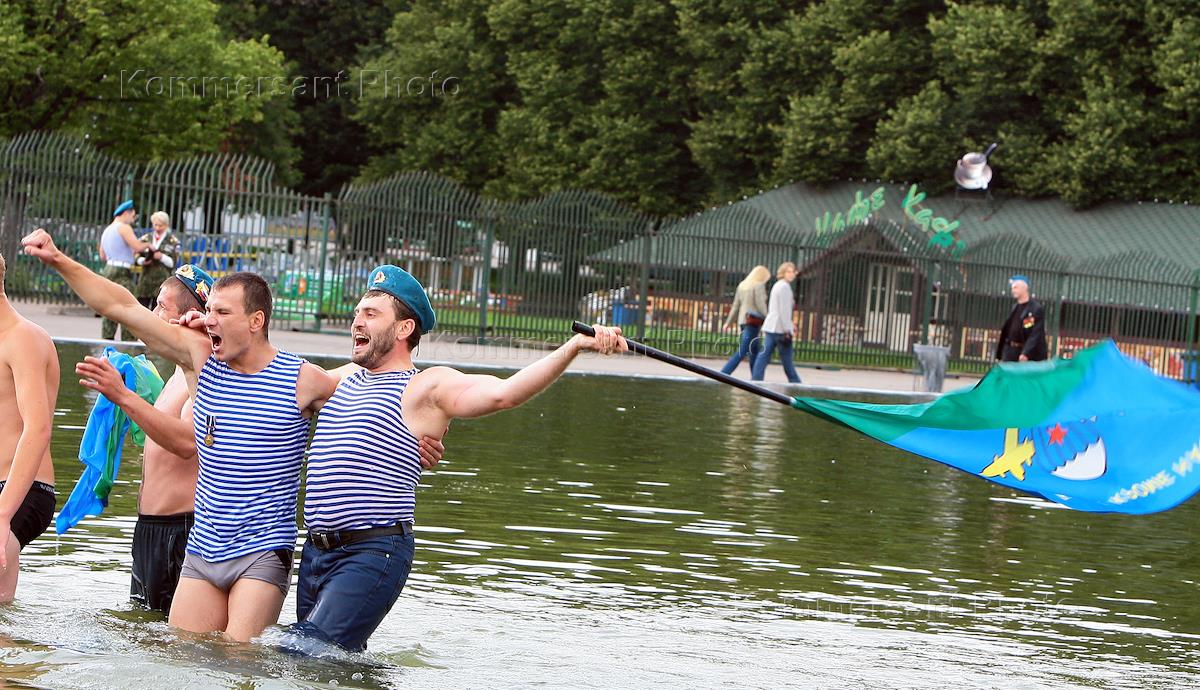 Бывшие воины десантных войск во время купания в фонтане Парка (ЦПКО) имени Горького на праздновании…