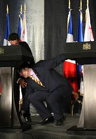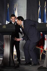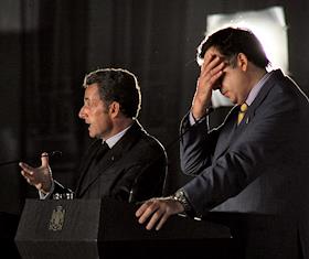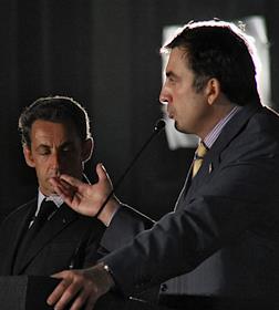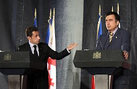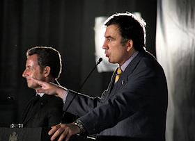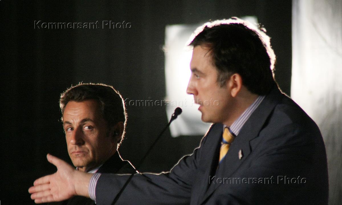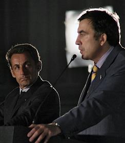 Президент Франции Николя Саркози (слева) и президент Грузии Михаил Саакашвили (справа) во время…