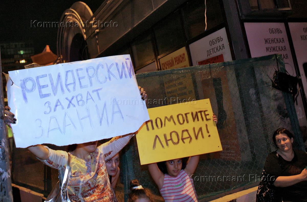 Экономика и бизнес Пикет продавцов и владельцев магазина на Ленинградском проспекте против рейдерского захвата. Плакаты "Рейдерский захват здания" и "Помогите люди!". Пикет прошел у метро "Сокол".