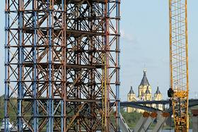 Строительство метромоста через Оку. Решетчатая опалубка и кран с храмом Александра Невского.