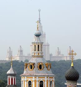 Андреевский монастырь на фоне Московского государственного университета (МГУ) имени М.В.Ломоносова.