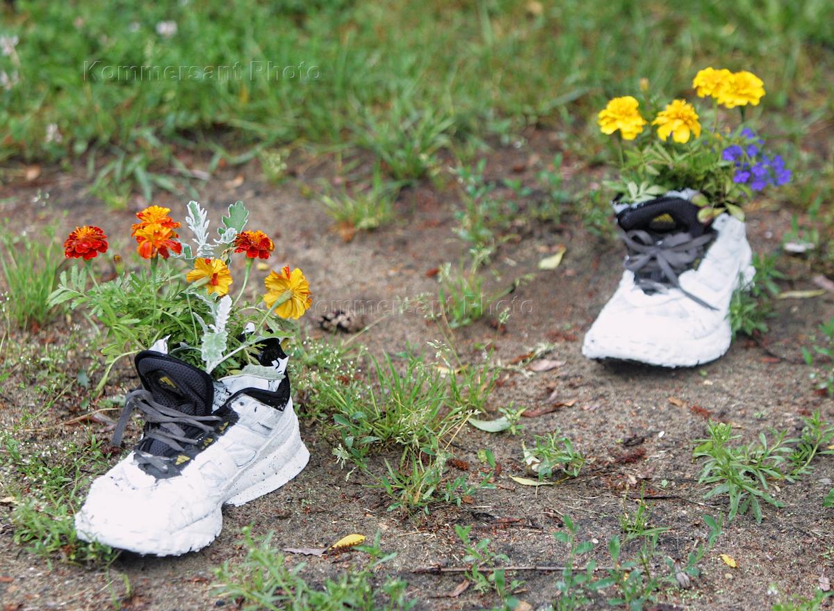 Цветы, посаженные в кроссовках, на пляже в Серебряном бору.
