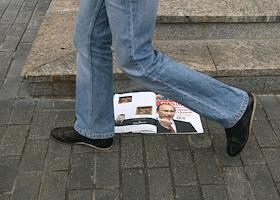Журнал "Власть" с портретом Владимира Путина на обложке под ногами прохожих.