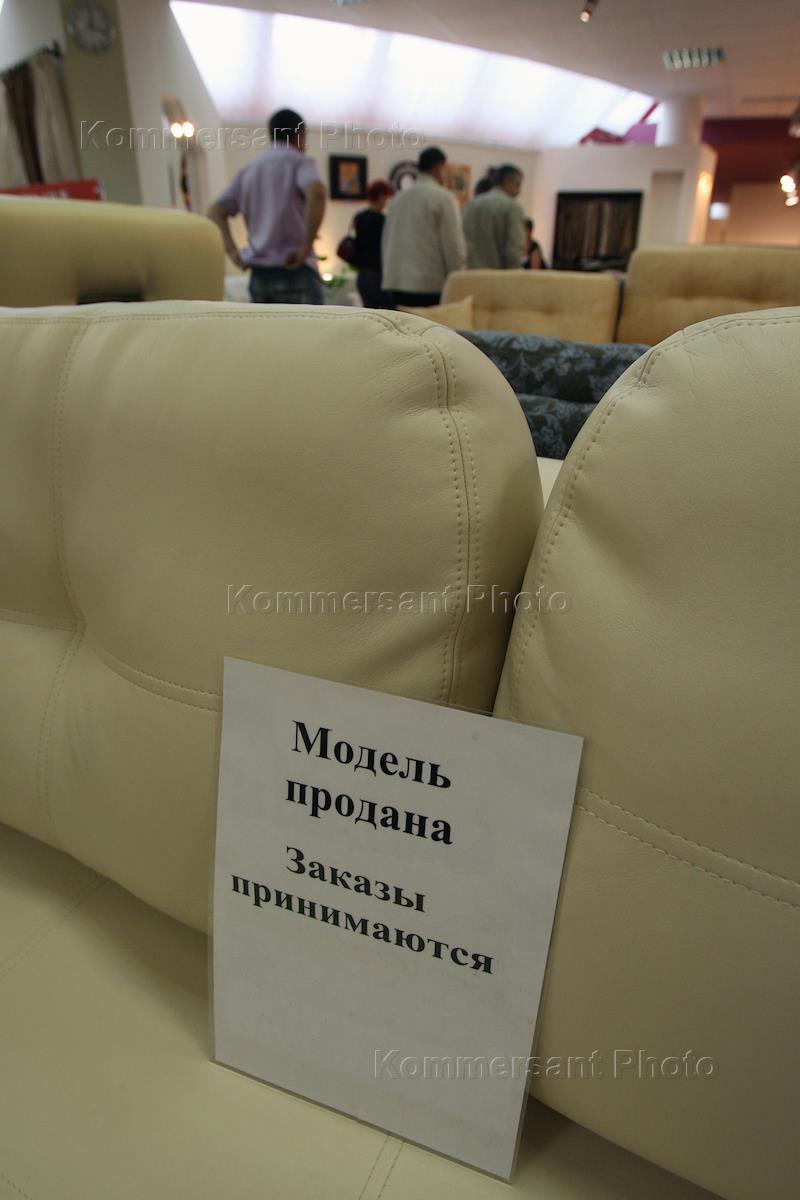 Мебельный салон "Диваны тут". Табличка "Модель продана. Заказы принимаются" на диване.