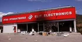 Разбитое и сгоревшее здание магазина бытовой техники Elit Electronics после боевых действий в городе.