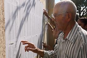 Выдача денежной помощи населению города Цхинвал. Мужчина ищет свою фамилию в списках на стене.