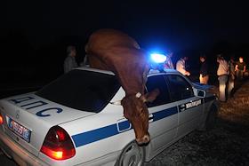 Столкновение патрульного автомобиля милиции (ДПС) и коровы на загородной трассе.