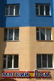 Жилой дом в центре города. Вывеска магазина "Мягкий дом".