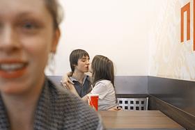Жанровая фотография. Влюбленная пара целуюется в кафе.