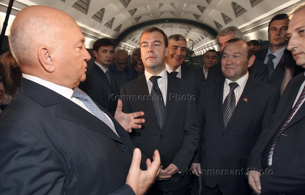 Мэр Москвы Юрий Лужков (слева), президент России Дмитрий Медведев (второй слева) и начальник…