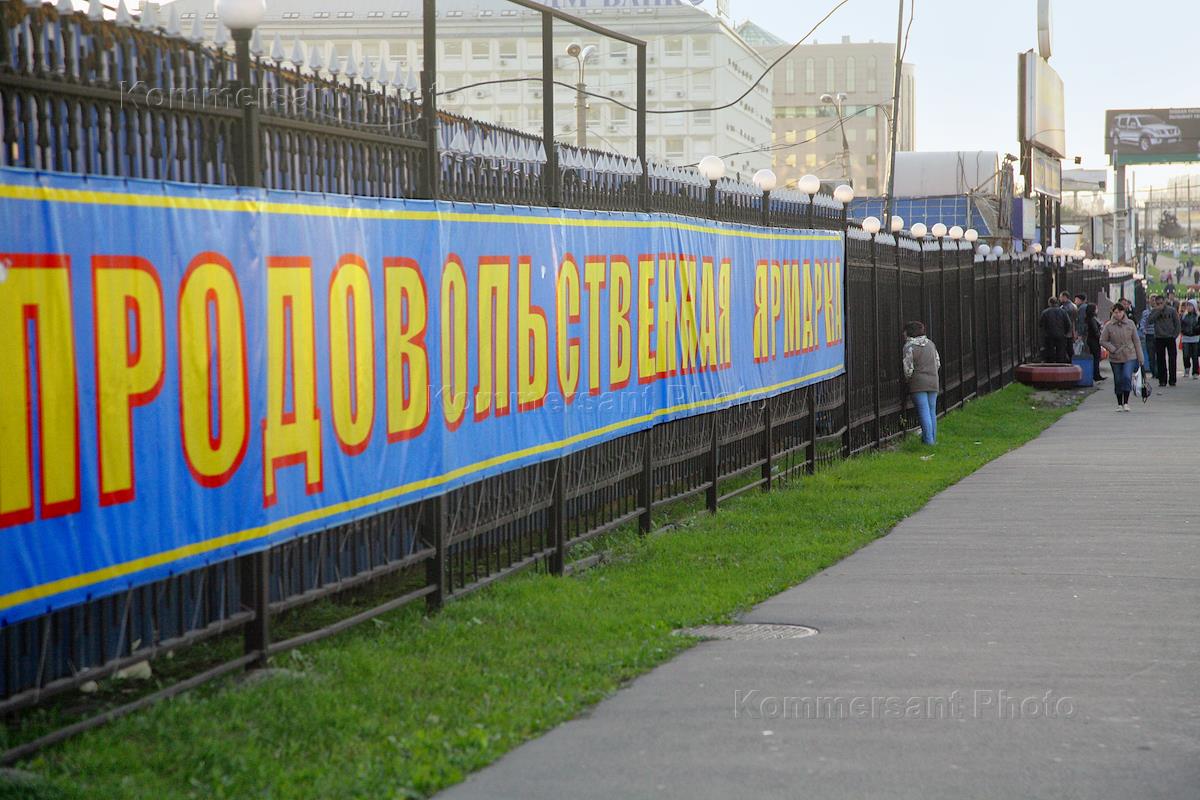 Жанровая фотография. Вывеска "Продовольственная ярмарка" на заборе Тушинского рынка на Волоколамском…