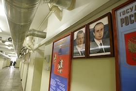Портреты президента России Дмитрия Медведева и председателя правительства России Владимира Путина на…