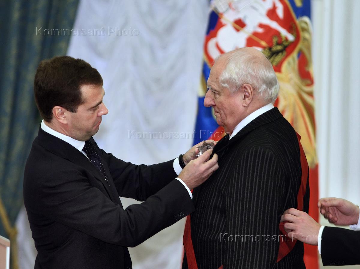 Президент России Дмитрий Медведев (слева) и актер Юрий Яковлев (справа) на церемонии вручения…