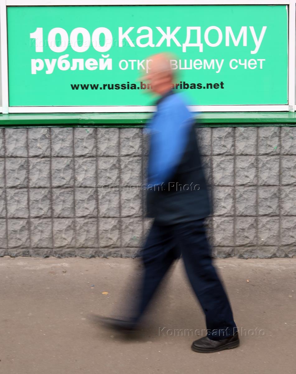 Жанровая фотография. Мужчина идет на фоне плаката с надписью "1000 рублей каждому кто откроет счет!".