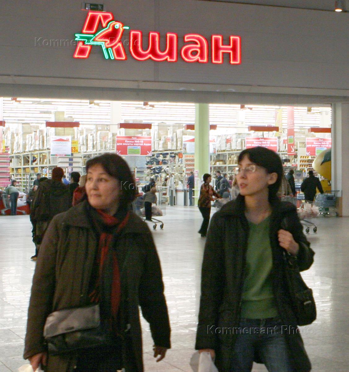 Покупатели у входа в гипермаркет "Ашан - Белая Дача".