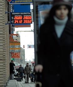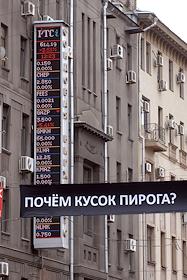 Рекламная растяжка "Почем кусуок пирога?" на фоне здания Фондовой биржи Российская Торговая Система…