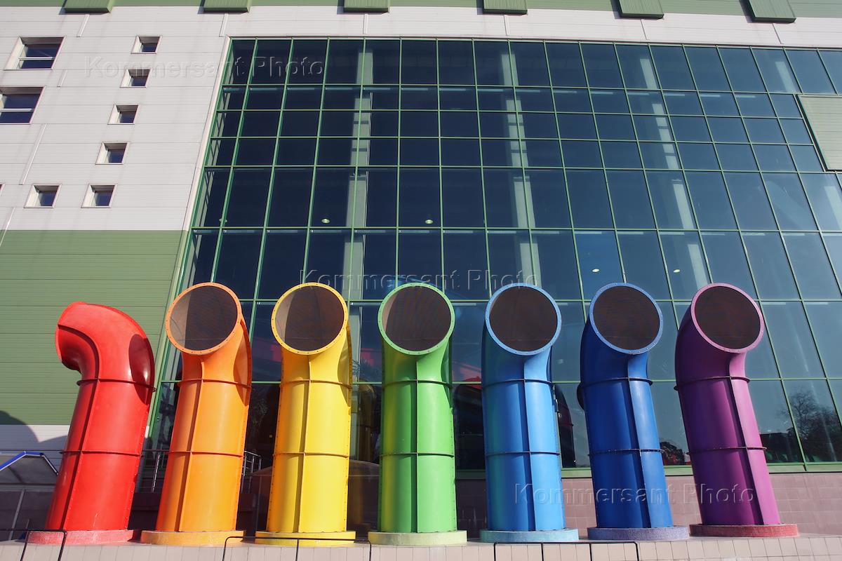 Трубы, выкрашенные всеми цветами радуги, на фоне торгового комплекса "XL" на Ярославском шоссе.
