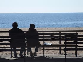 Брайтон - район русских эмигрантов. Отдыхающая пара на берегу моря на пляже Брайтон-бич.