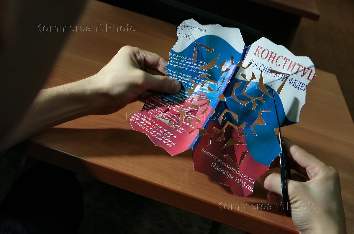 Жанровая фотография. Мужчина ножницами разрезает брошюру "Конституция Российской Фуедерации".