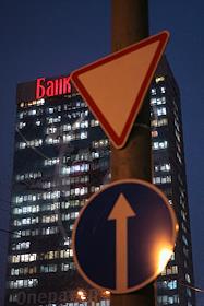 Жанровая фотография. Вывеска на офисе банка и дорожный указатель "поворот".