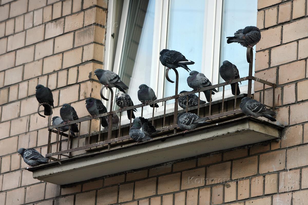 Нахохлившиеся голуби на подоконнике жилого дома на Плющихе.
