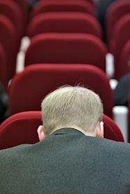 Жанровая фотография. Сидящий в зале мужчина и ряд пустующих кресел.