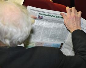 Жанровая фотография. Мужчина держит газету с заголовком "Коттедж для Обамы".
