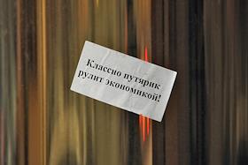 Жанровая фотография. Плакат с надписью "Классно путярик рулит экономикой!" на стеклянной витреине…