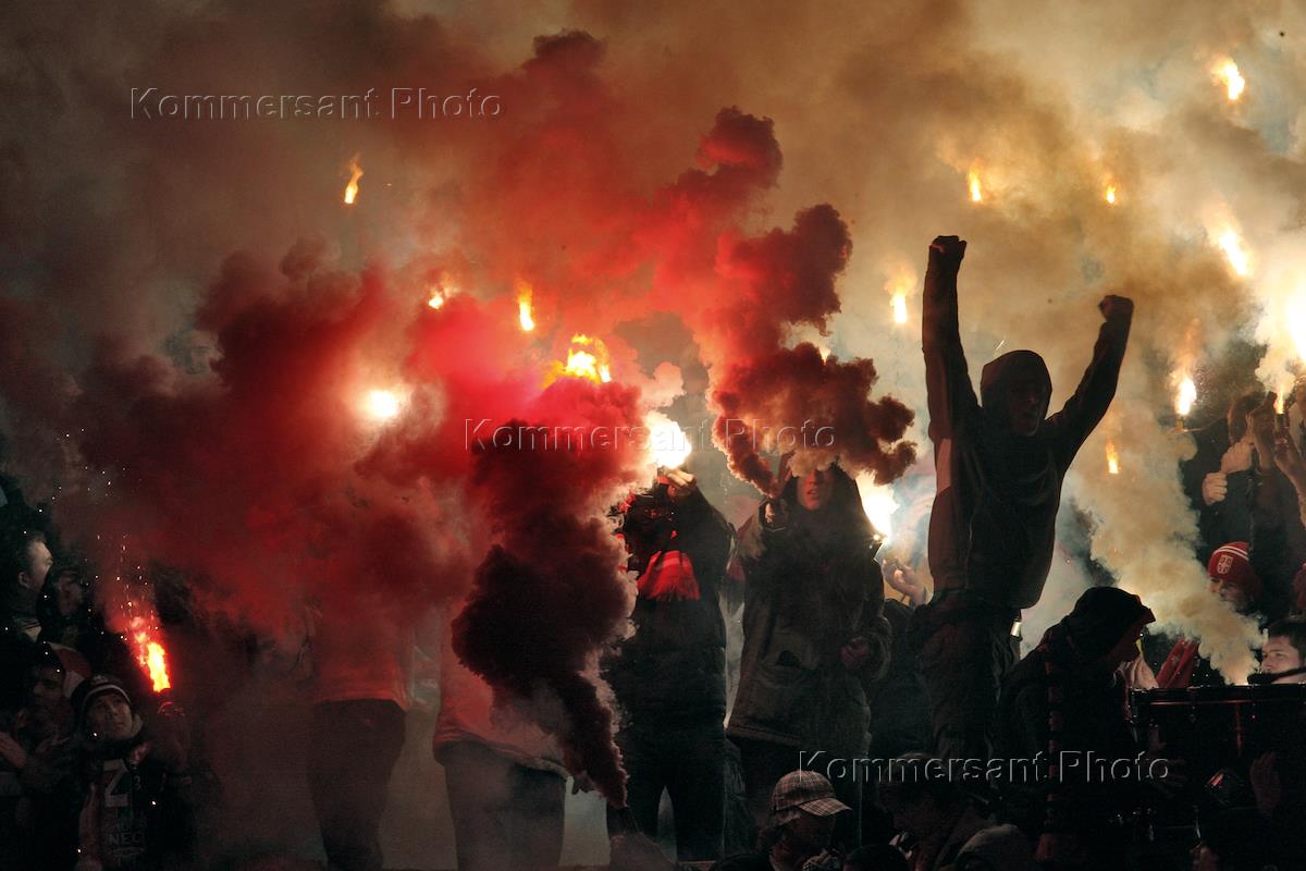 Групповой этап Кубка УЕФА. Болельщики во время футбольного матча между командами "Спартак" (Москва,…