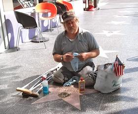 Жанровая фотография. Мужчина-инвалид чистит звезды с именами знаменитостей на бульваре в Голливуде.