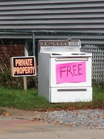 Жанровая фотография. Табличка "Частная собственность" и газовая плита с табличкой "Свободна".